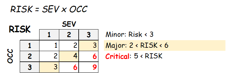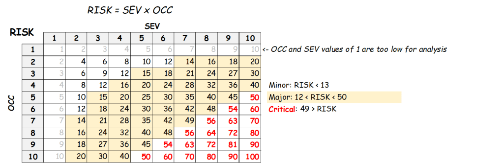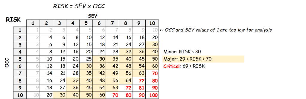 Risk is commonly referred to in one of three levels – Minor, Major, and Critical. Minor risk typically does not affect the capability of the part or system to achieve the intended results – this means things like cosmetic defects happening at almost any frequency, or more significant imperfections happening vary rarely. Major risk refers to affecting the output such that it cannot achieve the intended result. Critical is an extension of Major such that the risk may impact more than just the subject under consideration, or may impact the subject under consideration to the extent that it becomes a threat to the company. To convert the Severity and Occurrence to Risk just multiply the two together and then refer to this table:
